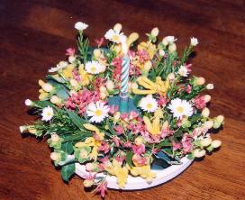 一つずつ花を分けた孔雀草を最後に散らします。全体のイメージを見て余り高くならないように…。